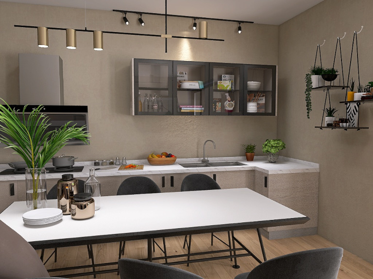 În colțul dedicat bucătăriei, mobilierul modern în nuanță de gri lucios continuă tema de eleganță și contemporaneitate. Cu un design ergonomic, acesta optimizează funcționalitatea, răspunzând nevoilor zilnice, fără a sacrifica stilul.
