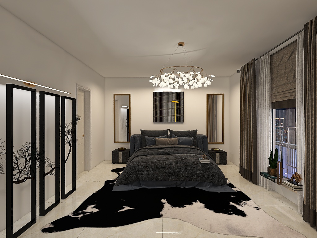 Acest dormitor alb, cu un covor zebra captivant, un dulap din oglinzi și un șemineu elegant, este mai mult decât un simplu loc de odihnă; este un spațiu care inspiră liniște și relaxare, îmbină armonios stilul cu confortul, oferind astfel o oază de liniște în viața ta.