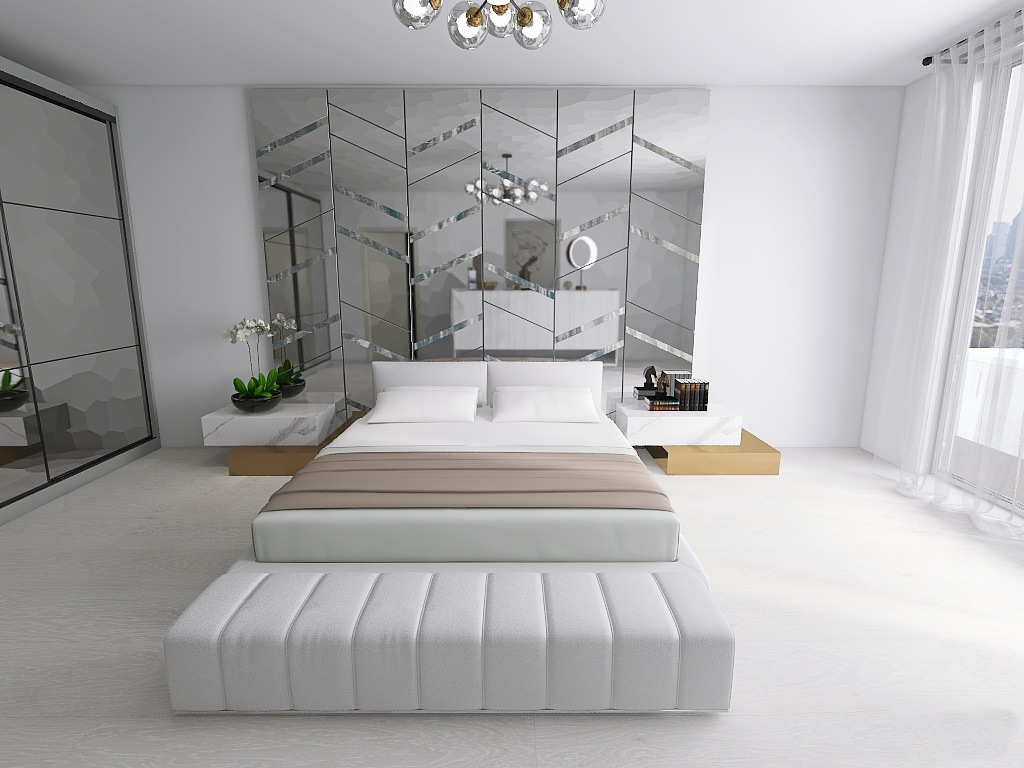 Acest dormitor alb, cu oglinzi care reflectă eleganța și stilul, oferă nu doar un loc de odihnă, ci și un sanctuar personal, în care fiecare detaliu contribuie la o atmosferă plăcută și relaxantă. Este locul perfect pentru a te retrage după o zi lungă, unde poți savura momente de liniște și confort, într-un cadru rafinat, ce îmbină frumusețea estetică cu funcționalitatea.