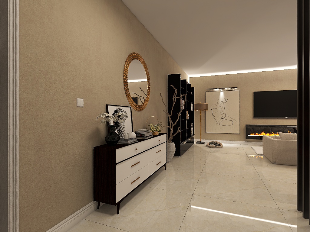 Acest hol, se concentreaza pe crearea unui spațiu primitor și sofisticat, utilizând o paletă de culori calde și materiale de calitate superioară. Pereții zugrăviți în nuanțe de bej aduc un sentiment de căldură și confort, în timp ce marmura albă adaugă o notă de lux și rafinament.