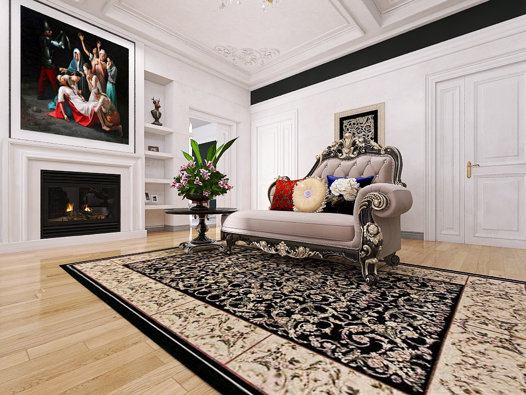 Canapeaua în stil clasic baroc, de culoare crem, adaugă un parfum de noblețe, fiind accesorizată cu perne colorate care îmbogățesc paleta de culori a camerei. Șemineul, un element esențial într-un astfel de decor, invită căldura și confortul, perfecționând spațiul pentru întâlniri relaxante cu prietenii și familia.