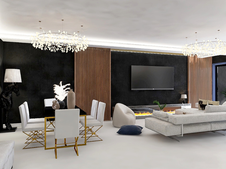 Acest living și dining modern îmbină cu măiestrie eleganța contemporană cu un aer sofisticat. Pereții negri creează un fundal dramatic, accentuând frumusețea elementelor albe din interior. Canapeaua de tip coltar, oferă un spațiu primitor, în timp ce mobilierul alb completează armonia estetică. Masa din sticlă neagră , cu picioare aurii, devine punctul focal al zonei de dining, reflectând luxul și rafinamentul.